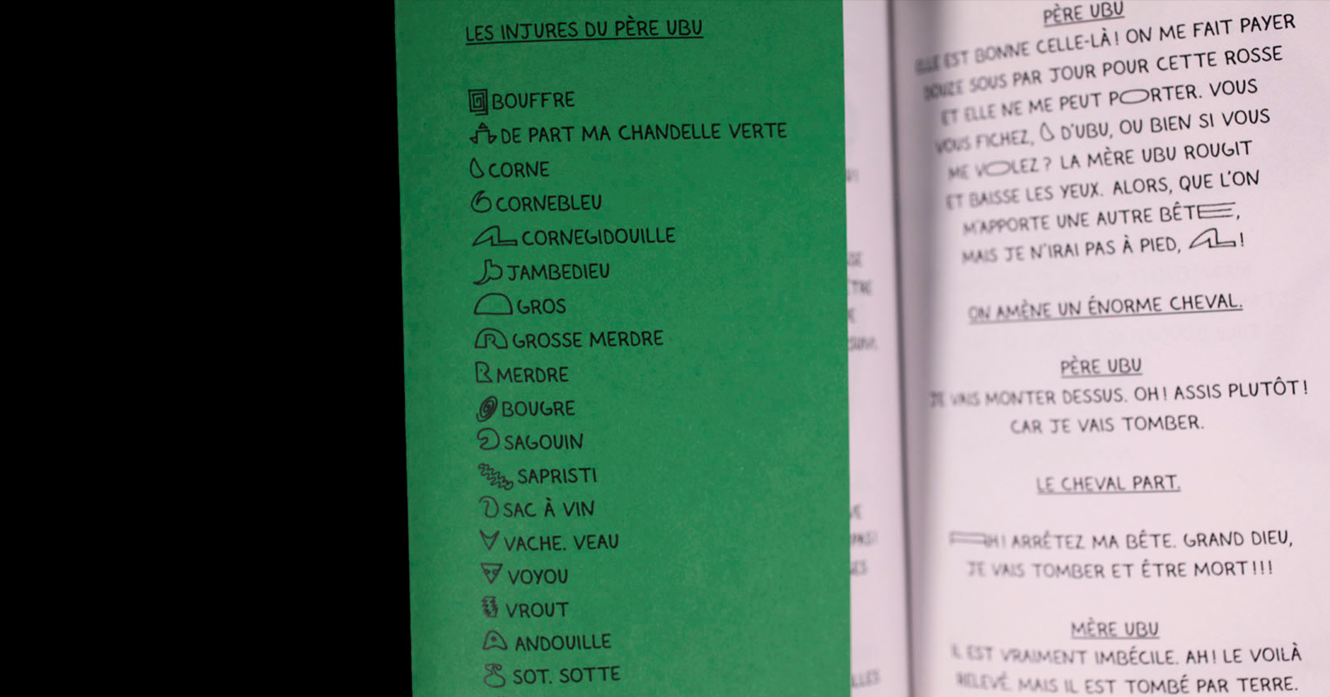 Vrout est une écriture composite à partir des injures du Père Ubu, le personnage d’Alfred Jarry dans la pièce Ubu Roi (1895). Les injures sont ici représentées par des signes. Mais... de par ma chandelle verte ! Comment représenter un son en signe ?